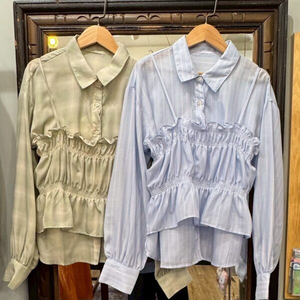【上衣】澎袖荷葉條紋襯衫